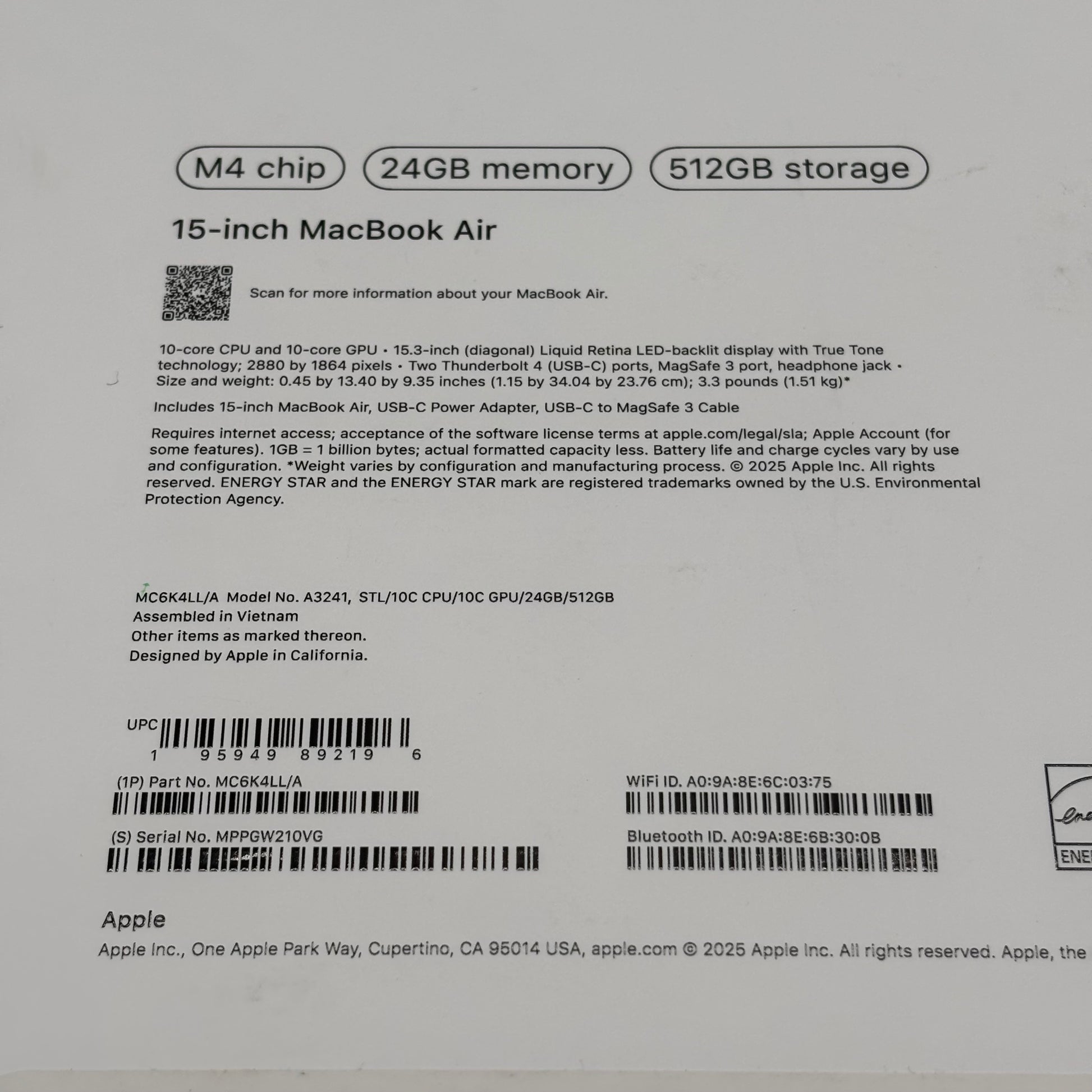 2025 Apple MacBook Air 15" M4 10 Core 4.5GHz 24GB RAM 512GB SSD A3241